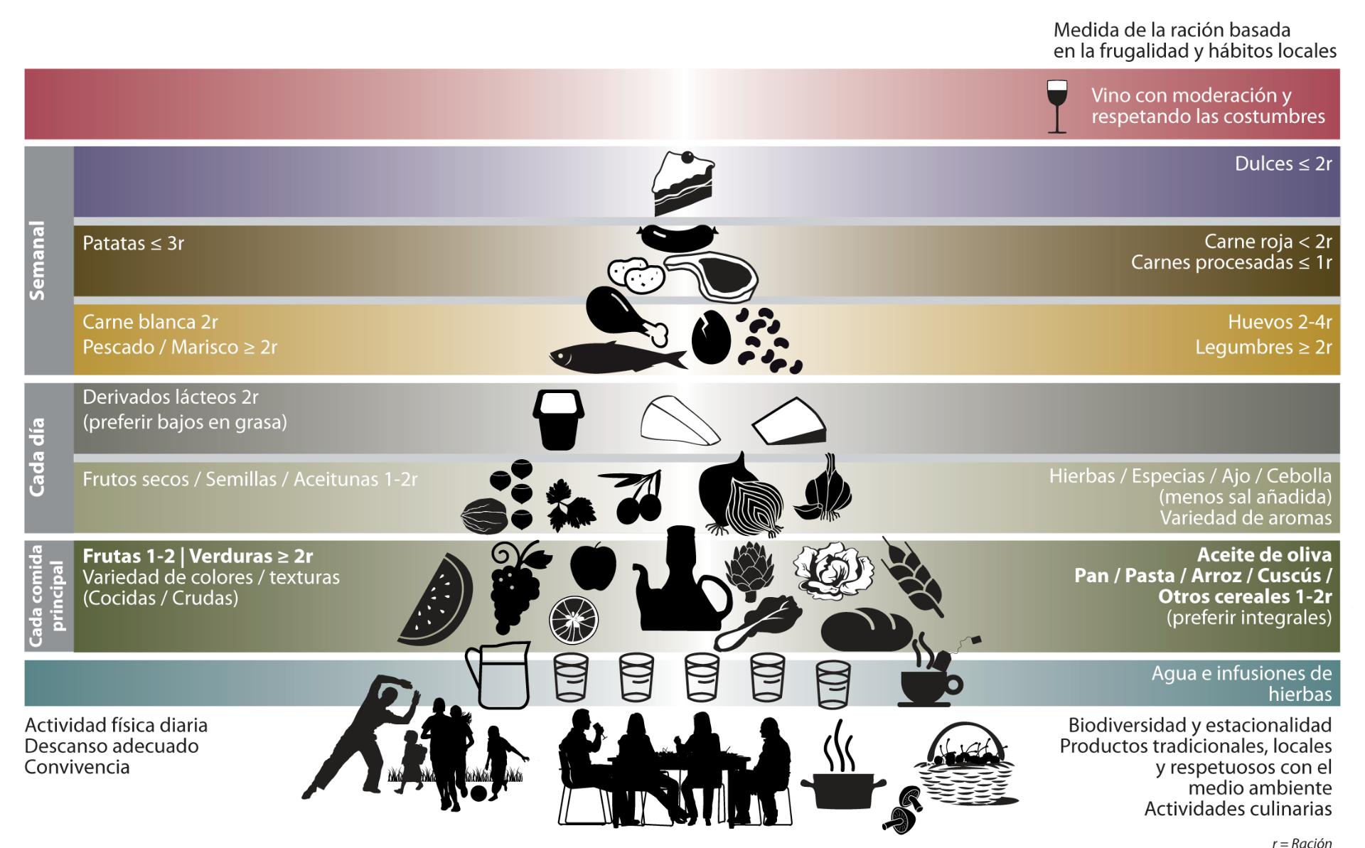 No obstante, no se trata sólo de dar prioridad a unos alimentos u otros, sino también de la manera de seleccionarlos, cocinarlos y consumirlos. Además refleja la composición y número de raciones de las comidas principales.